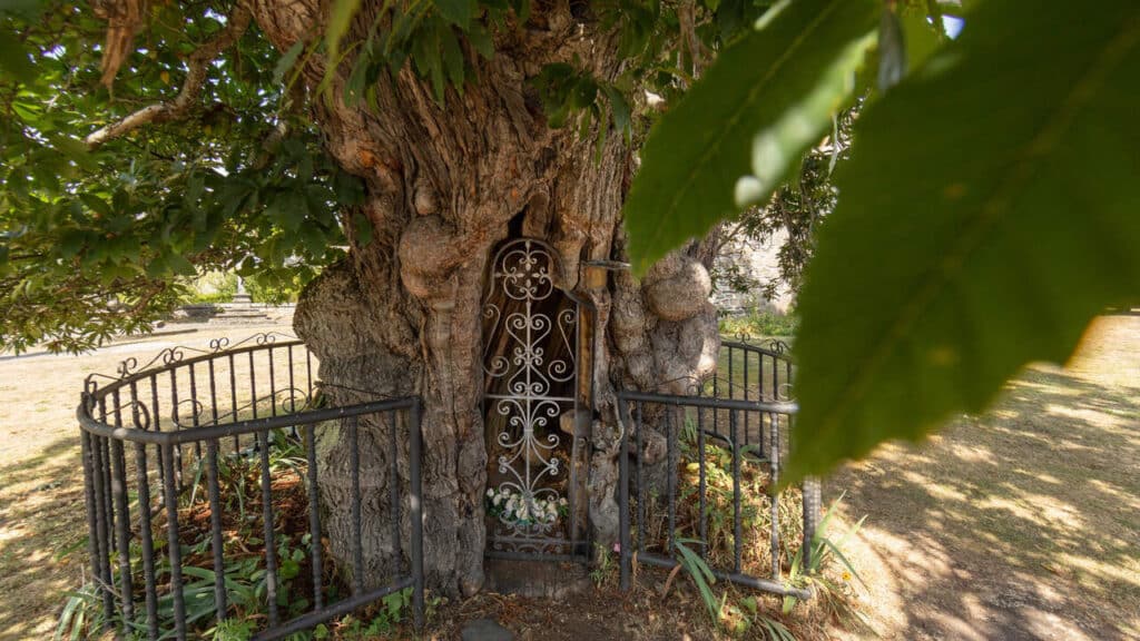 Un castaño de 700 años, salvado de la tala por el escultor Víctor Corral que esculpió una virgen en su interior. Se encuentra en el atrio de la iglesia de Santiago de Baamonde.