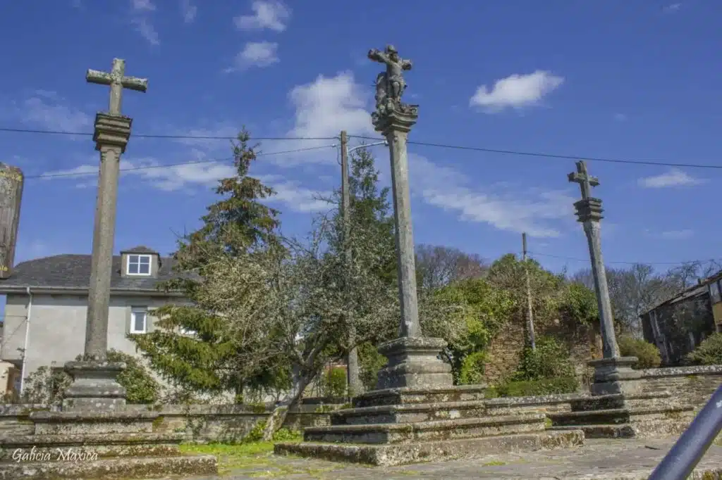 Tres cruceiros de granito del siglo XVIII en el atrio de la iglesia.